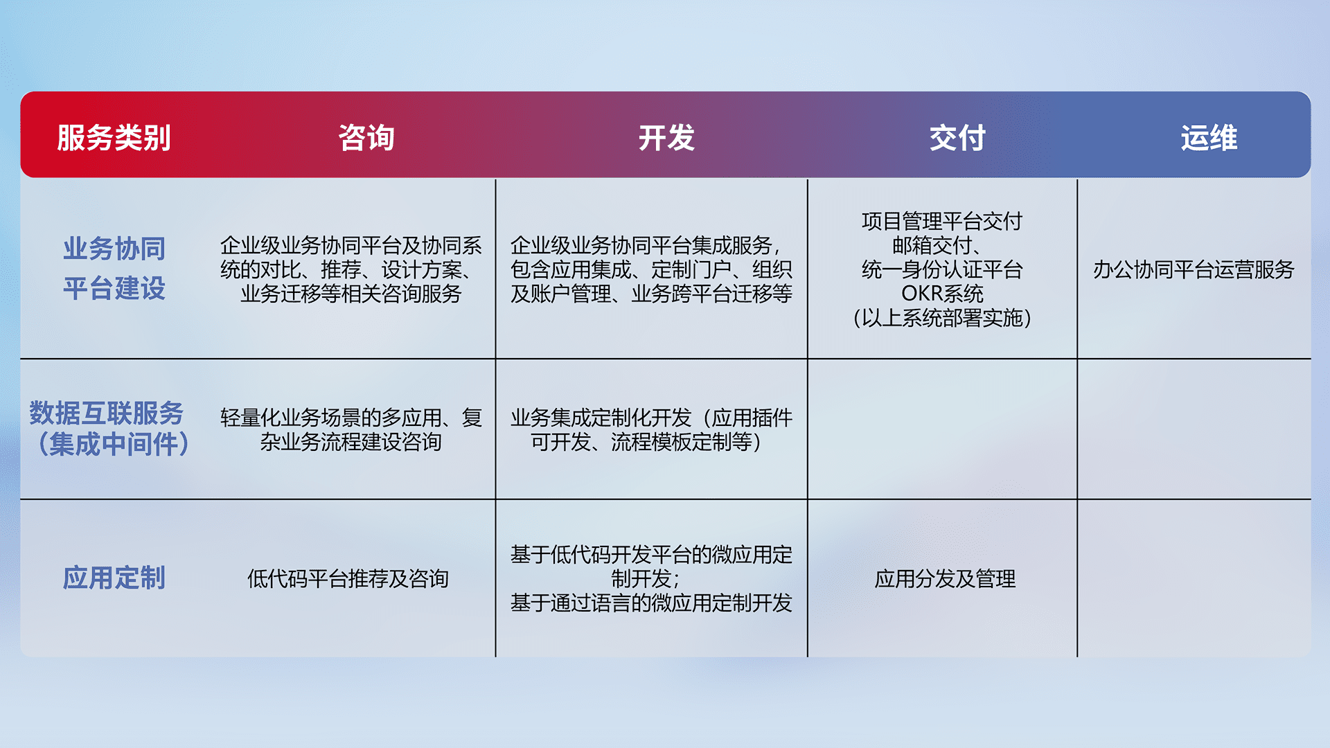 针对钉钉、、、、企微、、IDaas等平台级产品提供产品的规划、、、方案、、、交付、、、定制化开发等服务,,,实现如统一协同办公、、、、智能客户服务、、、、混合会议管理、、智能数据查询、、、等业务场景,,实现数字化转型。。。。