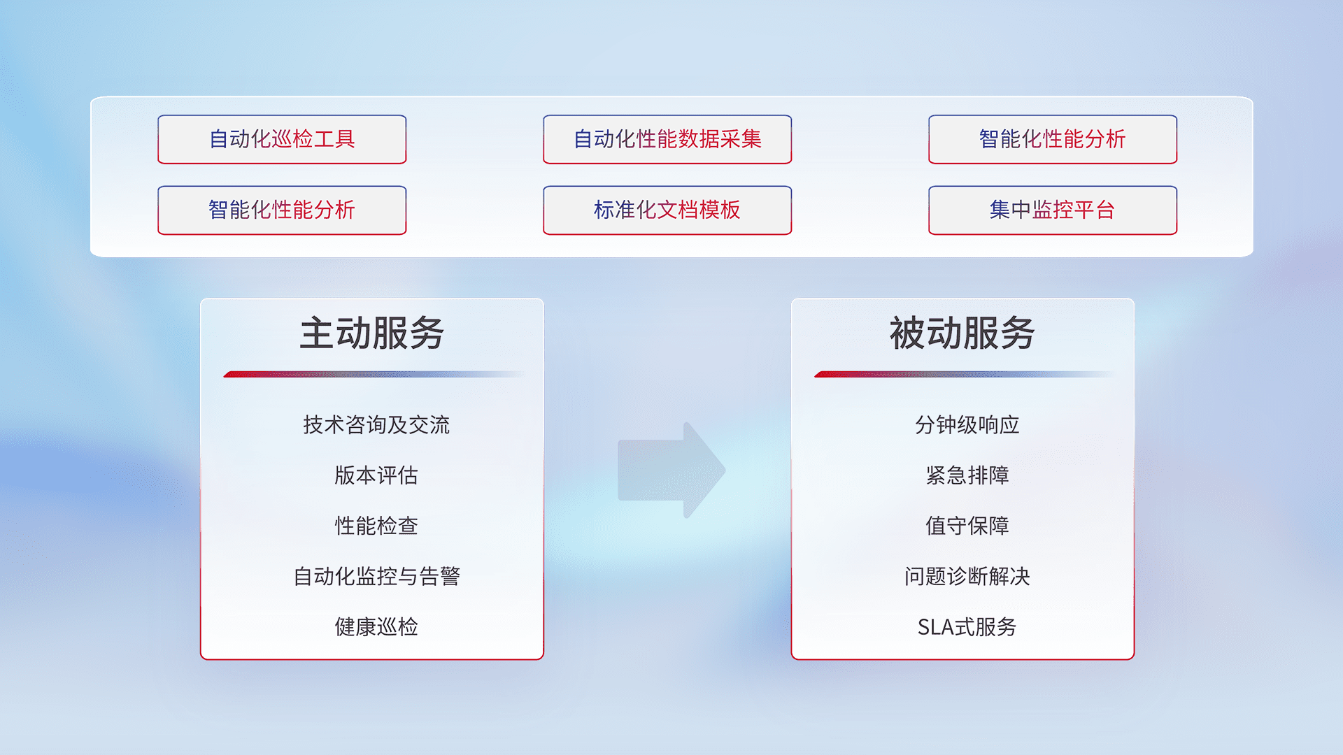智能化工具和标准化文档,,,保障服务质量,,提供主动服务(包含技术咨询、、、版本评估、、、、性能检查、、、自动化监控与告警、、、、健康巡检)和被动服务包含(分钟级响应、、、、紧急排障、、值守保障、、问题诊断解决、、、、SLA服务)。。。。