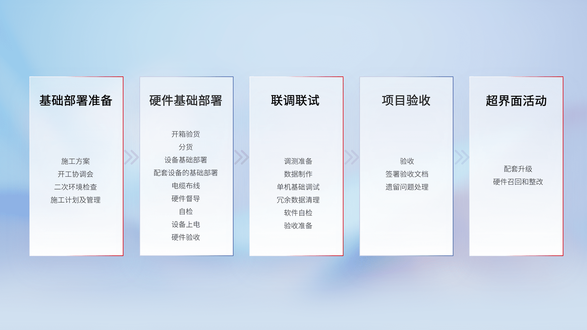 从基础部署准备、、、硬件基础部署、、、联调联试、、、、项目验收、、、越界面活动的全过程可追溯,,,,保证施工质量和进度。。。